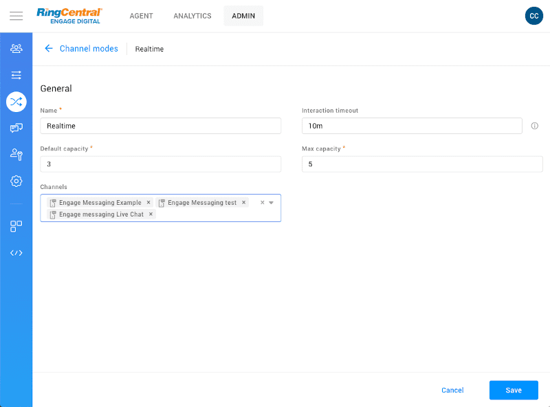 There are three types of channel modes: asynchronus, real time, and triage. For our testing purposes, we want real time, but for some interactions, the channel mode could be asynchronus (when responding to email for example). Find the channel mode settings under Routing, and then configure your channel mode.