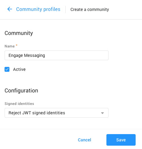 Communities are databases of identities associated with each source. There must be a community in order to create a source. You can create a community per type of source (Facebook, Twitter, RingCX Messaging, etc.), which can then be used when creating several sources of the same type. Follow the instructions to create a community. In this Quick Start, we'll create a RingCX Messaging community profile.