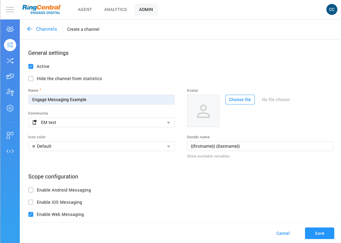 Then add our RingCX Messaging Example in the Channels field by selecting it from the dropdown.