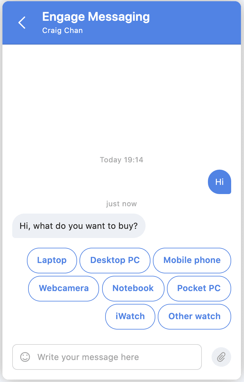 "body": "Hi, what do you want to buy?",