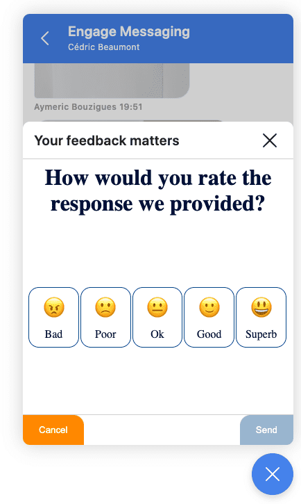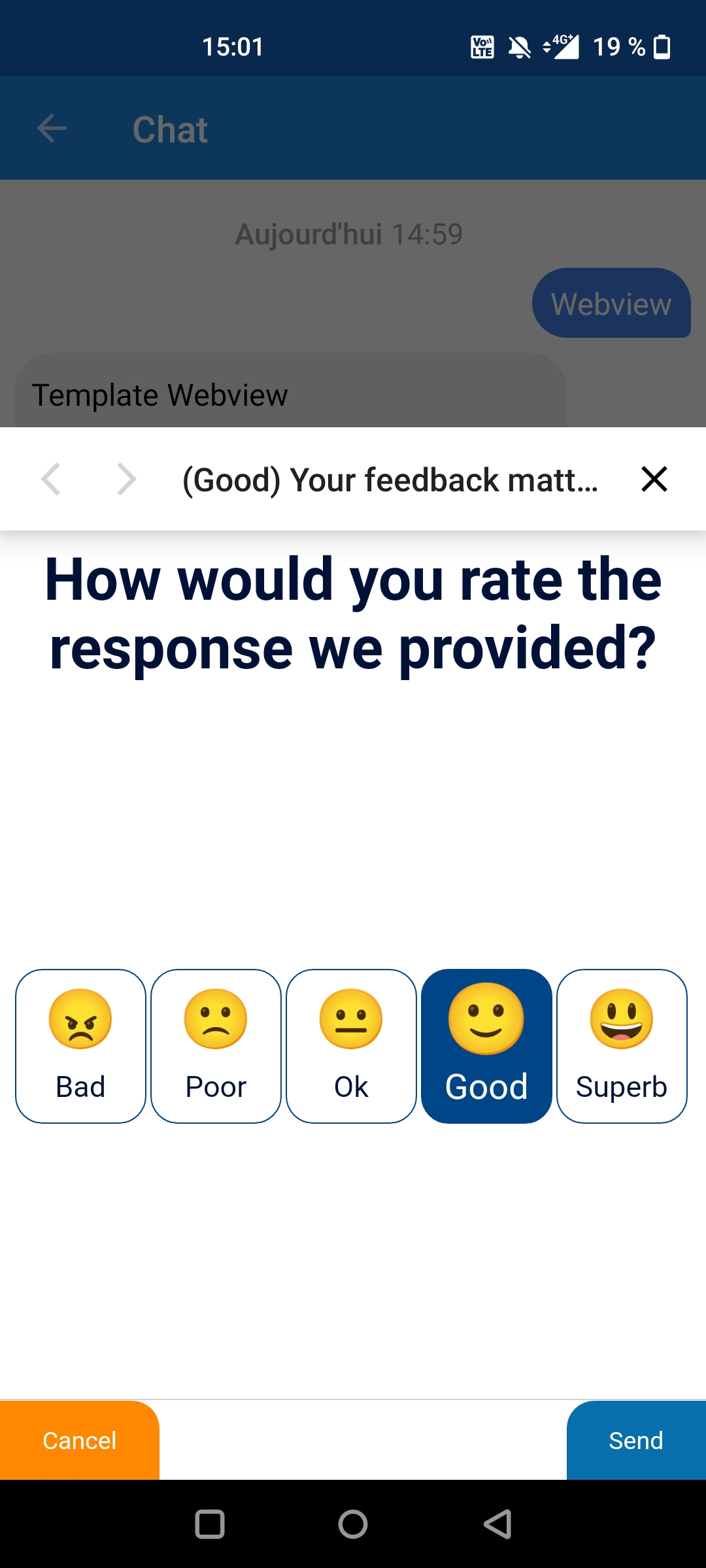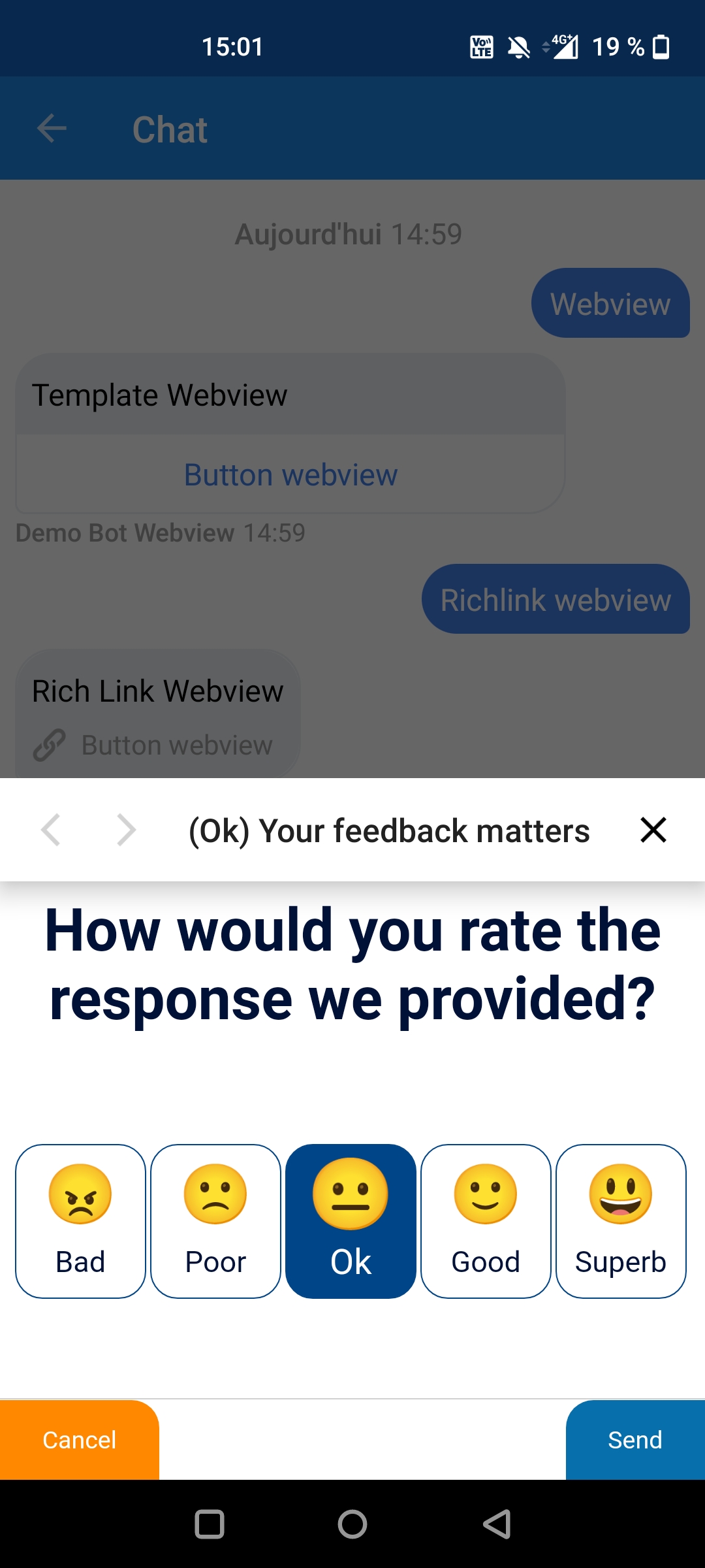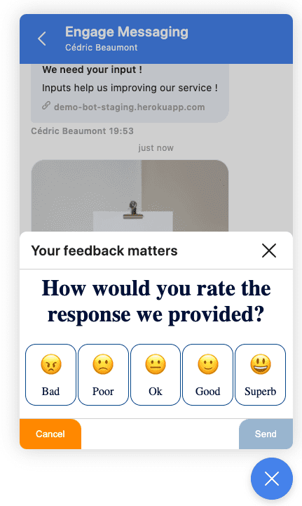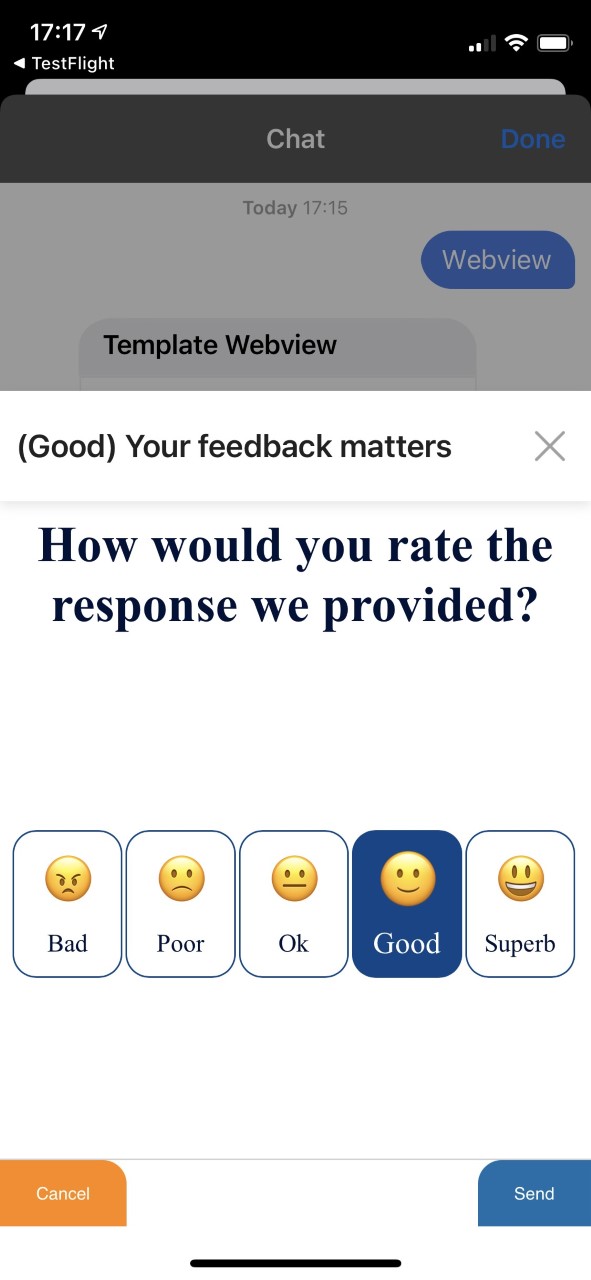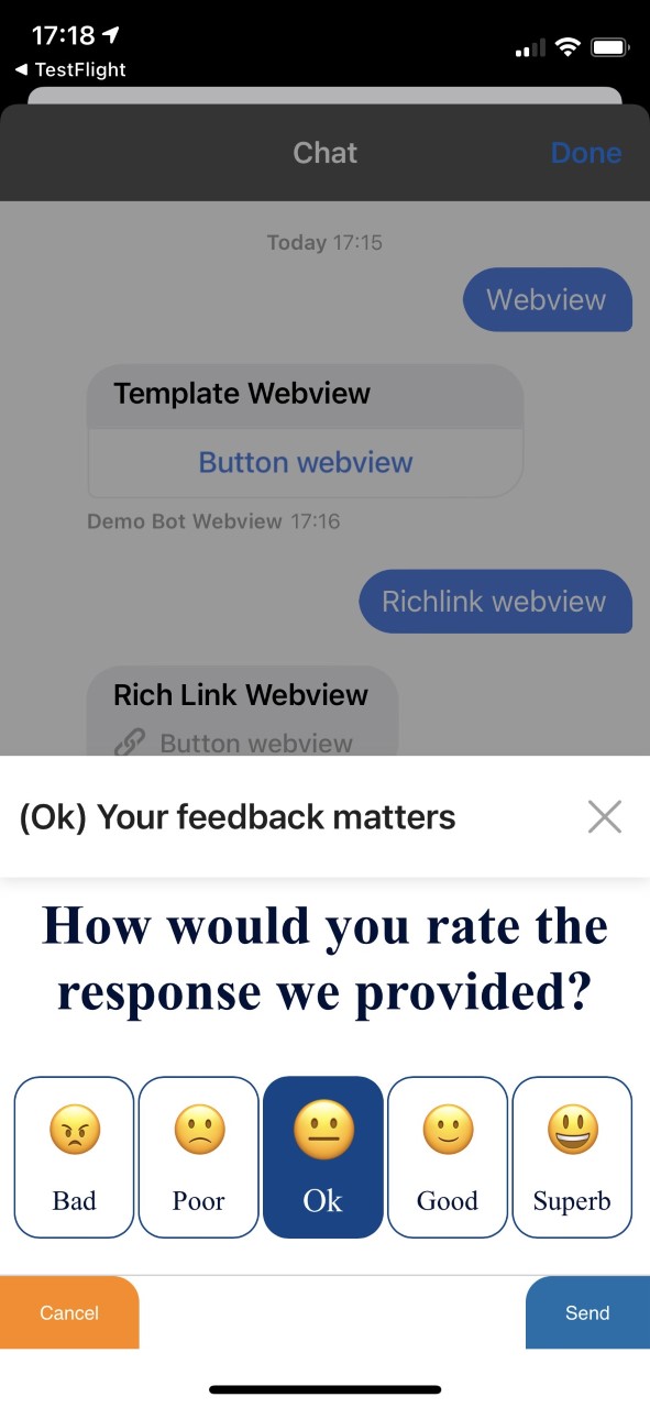 The webview is not just a simple window opening, it can be used to display a custom survey, to select a room or a seat on a train or even a more attractive way to select a subscription. For each action taken on the page, a custom response can be sent for the agent side, that can confirm a seat selection or express gratitude to a client indicating satisfaction.