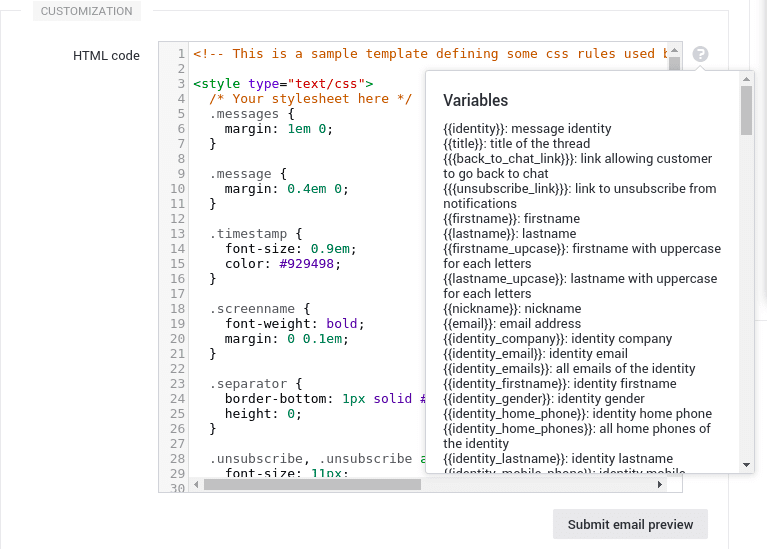 For new templates, html code is prefilled with the default template markup so you have an example of valid syntax. There is also a tooltip that explains how to customize and which interpolation variables and methods are available: