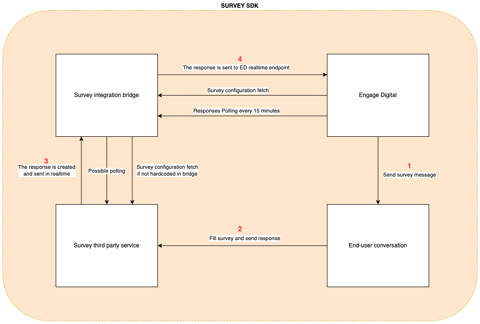 In the following diagram the "Survey integration bridge" is the part you are responsible for and its job is to allow data from the third party survey provider to be formatted and forwarded to RingCX Digital.