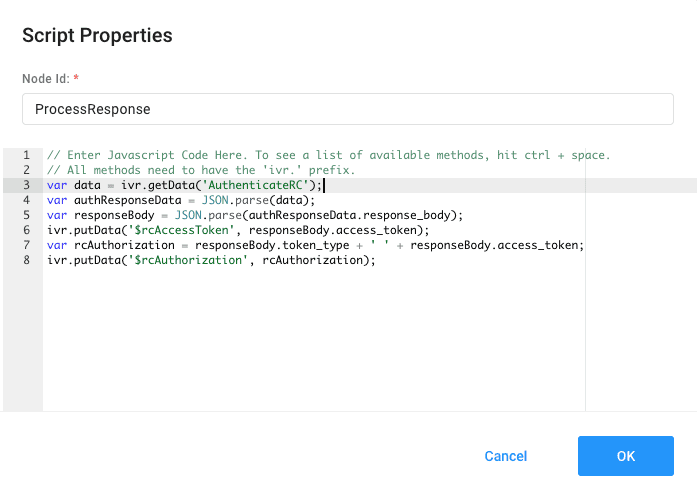 The Scripting node allows you to use custom JavaScript to add features to your IVR. Developers will be able to add extra power to their IVR with custom JavaScript. These JavaScript functions can access data from other nodes leading into this Scripting node or process data and store the data for use in other nodes. To learn more about Scripting node, following this link here.