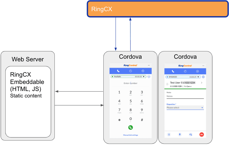 The following Mobile Framework was built to show how a developer could build an agent experience on a mobile device to integrate with RingCX. This example utilizes the RingCX Embeddable within Cordova, a mobile development framework. Since the Embeddable uses standard web technologies, this makes Cordova a great fit for packaging the Embeddable for distribution across iOS and Android app stores. A separate Web Server is expected to host the static web components including the HTML page and JavaScript code. That JavaScript code then communicates to the RingCX platform in the cloud.