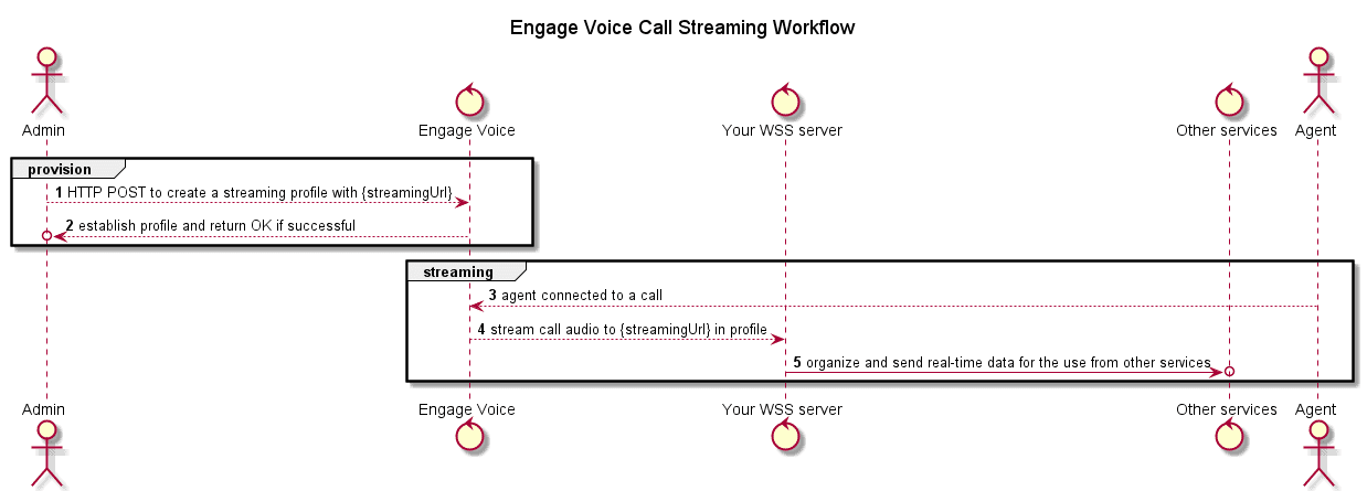 Call Streaming operates per Queue(inbound calls) or Campaign(outbound calls). The streaming service will be activated upon the creation of a streaming profile. As shown by the flow chart above, audio streams will be sent to your {streamingUrl} where your WebSocket server can do further processing.