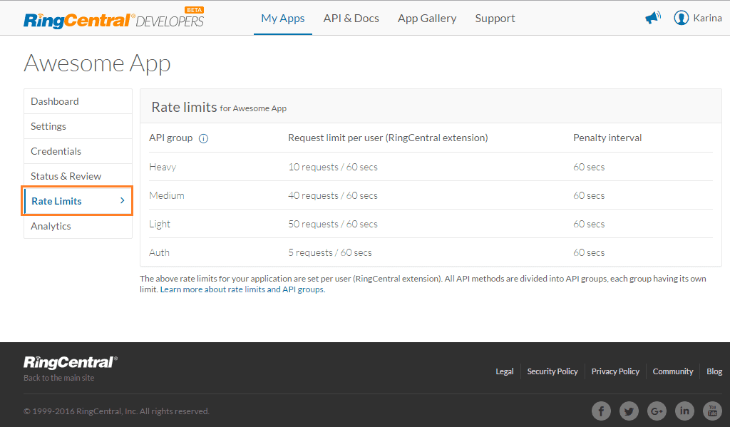In addition to our default limits, the RingCentral developer support organization has the ability to modify rate limits on an app-by-app basis in order to better service the unique needs of our developers. You can view your app's specific rate limits by logging into the Developer Console, loading your app's dashboard, and clicking "Rate Limits". That will show you a page similar to the following: