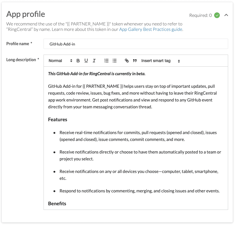 Use the profile editor to compose a profile that is both informative and attractive to potential customers. Our editor will prompt you not only for content that will be displayed publicly in the app gallery, but also information RingCentral administrators will use to help you promote your app throughout our app gallery network.