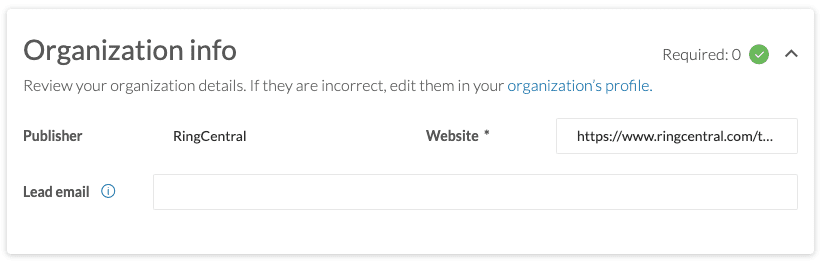 RingCentral will display a set of links and resources alongside your profile. We consider all of these links to be essential, even if they are not required. Please provide a link to your app's documentation, terms of service, your privacy policy, and a link to where customers can get support.