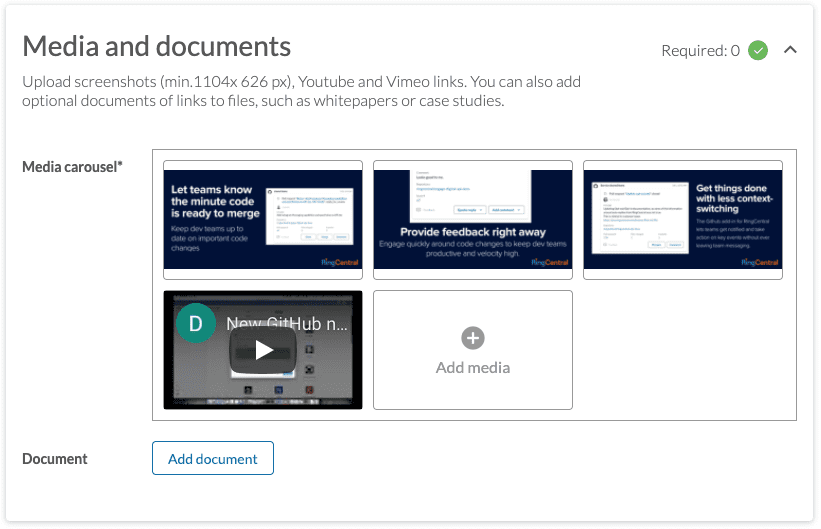 Arguably one of the most important aspects of your app's profile is the set of screenshots and videos you will upload. This will help customers visualize your product and how it specifically integrates with RingCentral.