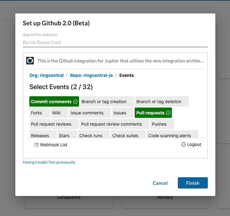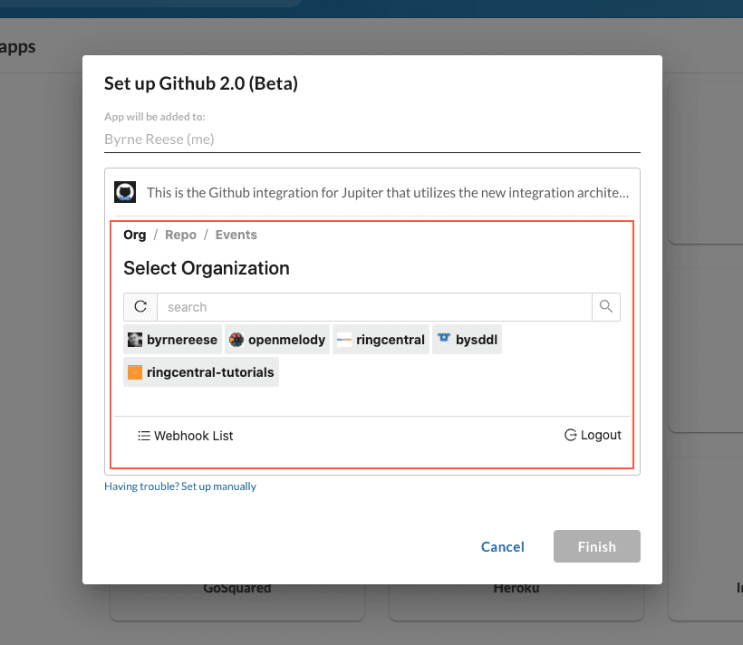 Once the user has selected to chat into which they want the app installed, RingCentral will generate an incoming webhook associated with that chat. The generated URL will be transmitted to the application in the next step.