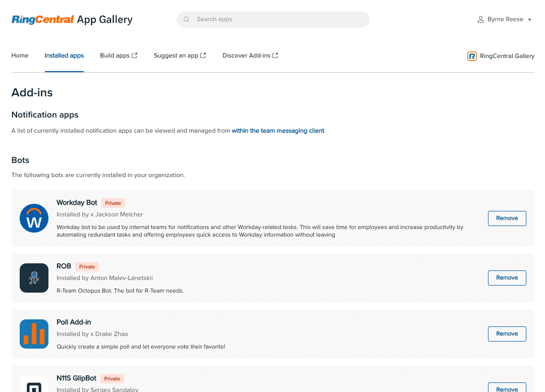Any user can view a list of the bots that are currently installed in their account by visiting the web-based App Gallery and by visiting the "Installed apps" tab. All installed bots will be listed under the Bots header.