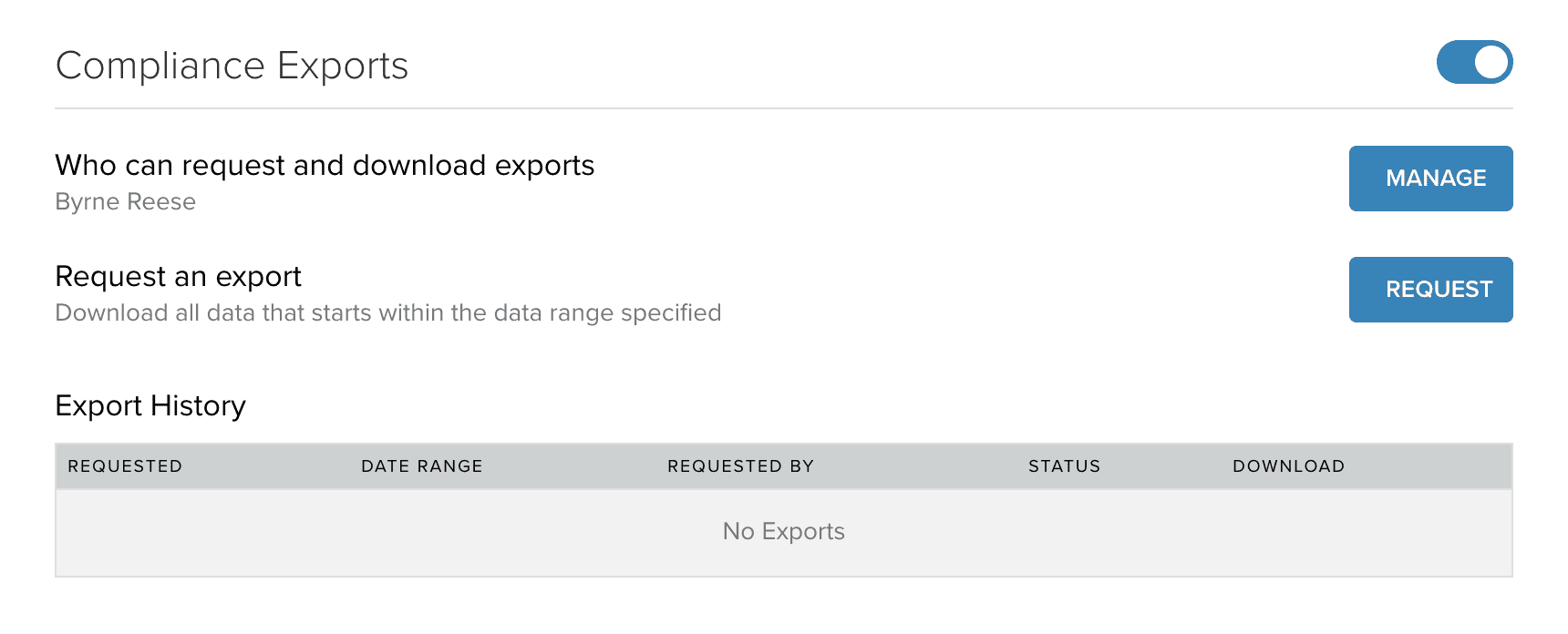 The Compliance Exports feature must be turned on from the RingCentral App in the Administration settings.