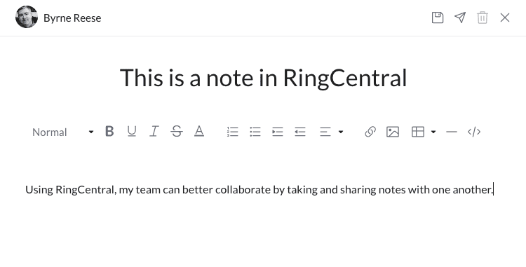 Notes in RingCentral give teams the ability to post, collaboritively edit and share simple text files with one another. They provide a perfect way to collect and share meeting agendas and minutes, ideas for an upcoming product, todo lists and action items, and you name it.