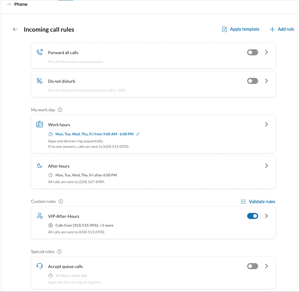 For example, a developer could configure a rule that forwards calls from VIP clients during after-hours to a mobile device, while routing all other calls to voicemail. This type of automation can significantly enhance responsiveness and customer service—particularly for use cases such as after-hours support, holiday call routing, or dynamic team scheduling.