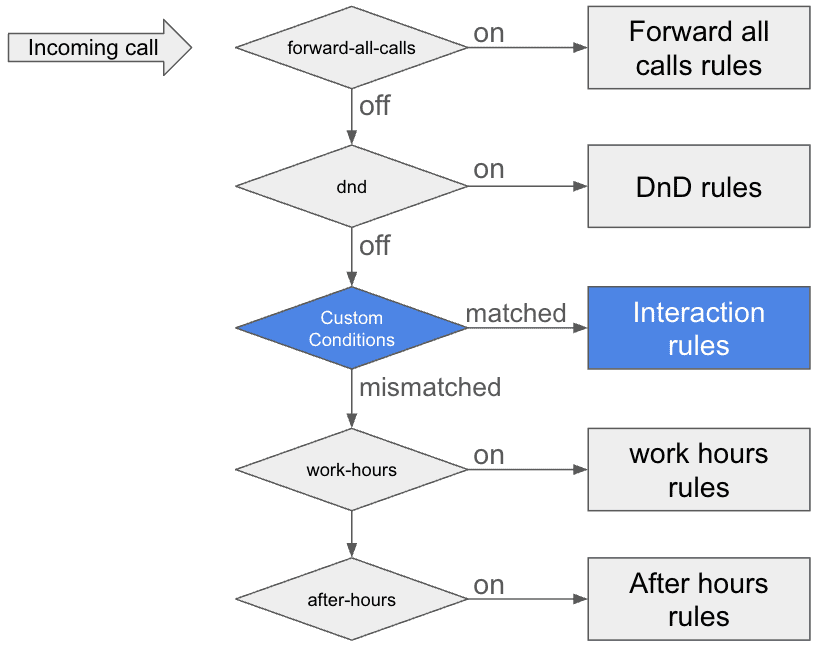 If a user has a custom rule, incoming calls to the user will be routed using the following logic: